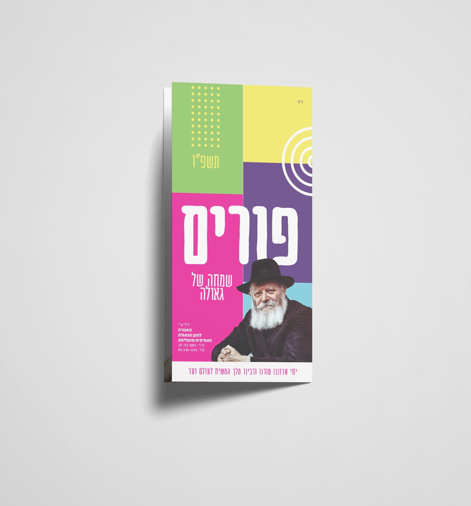 פרוספקט מהודר המסביר על חג הפורים עם מנהגי החג והלכותיו בעיצוב מהודר וחדשני (8 עמודות)